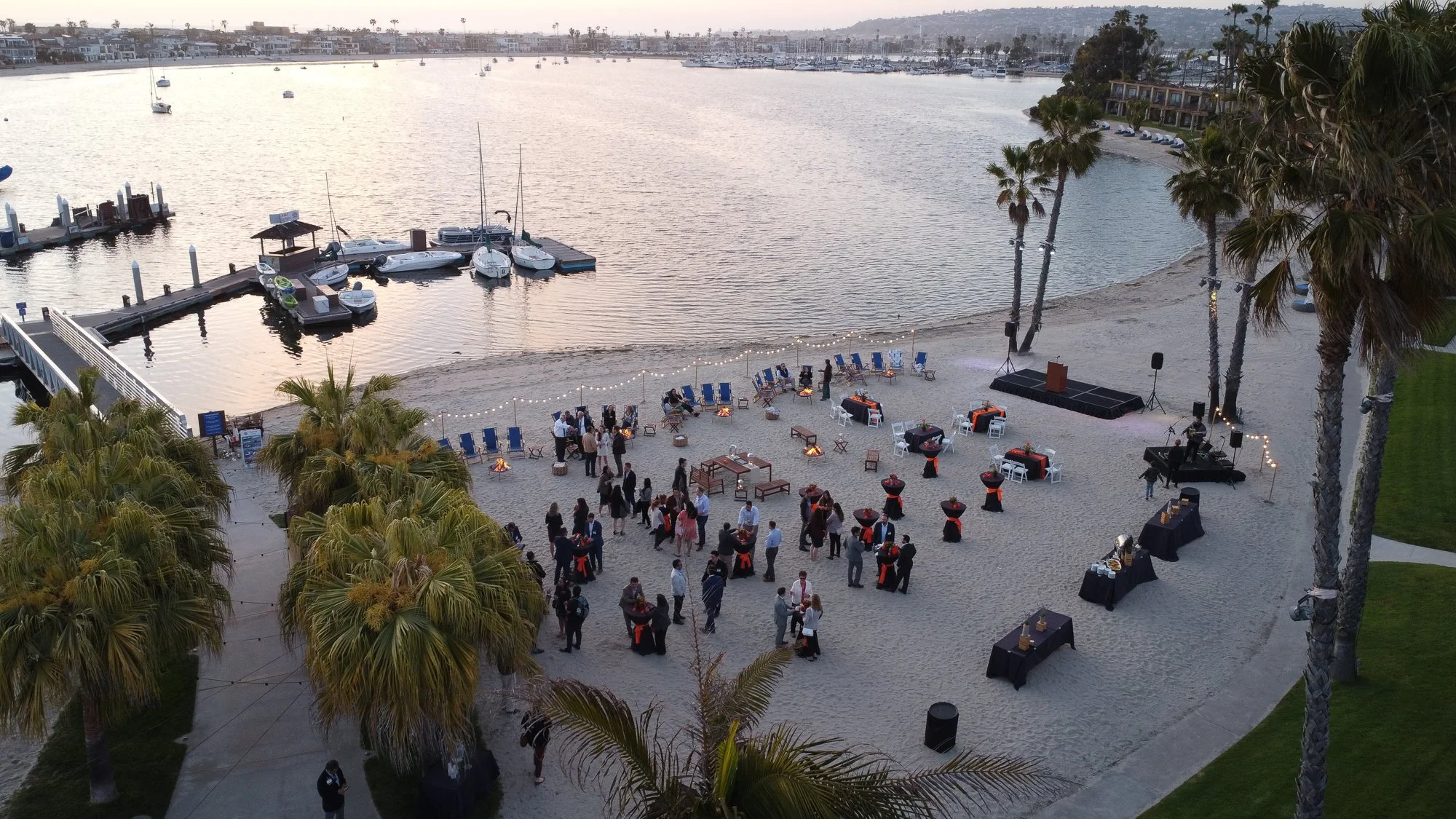 We love partnering with the banquets and events teams at the Bahia and Catamaran to add that cozy, golden-hour touch to weddings, welcome receptions, corporate dinners, and sunset celebrations.